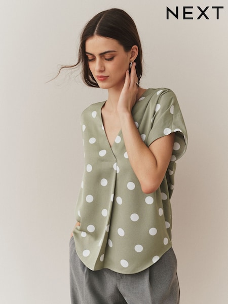 Green/White Polka Dot Short Sleeve V-Neck Blouse
