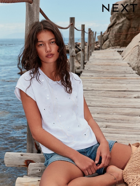 White Mirror Embellished Short Sleeve Crew Neck T-Shirt