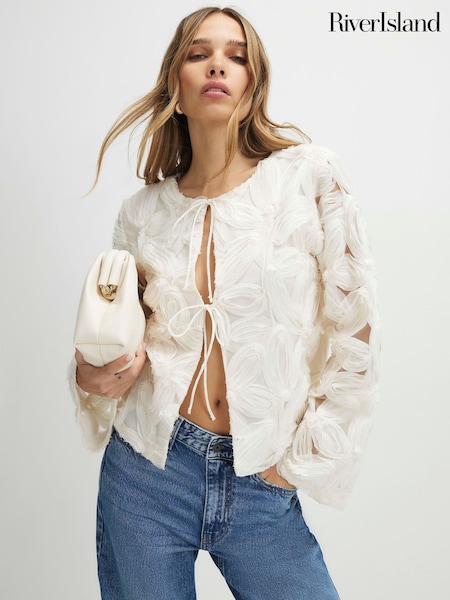 River Island Cream Long Sleeve Tie Front Floral Jacket