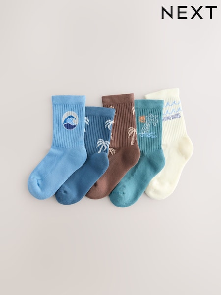 Blue/Green Graffiti Smile Cushioned Footbed Cotton Rich Ribbed Tipped Socks 5 Pack
