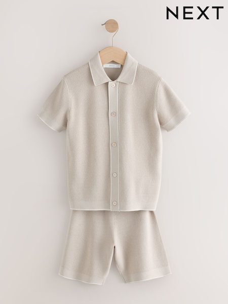 Neutral Textured Knitted Polo Shirt and Shorts Set (3-16yrs)