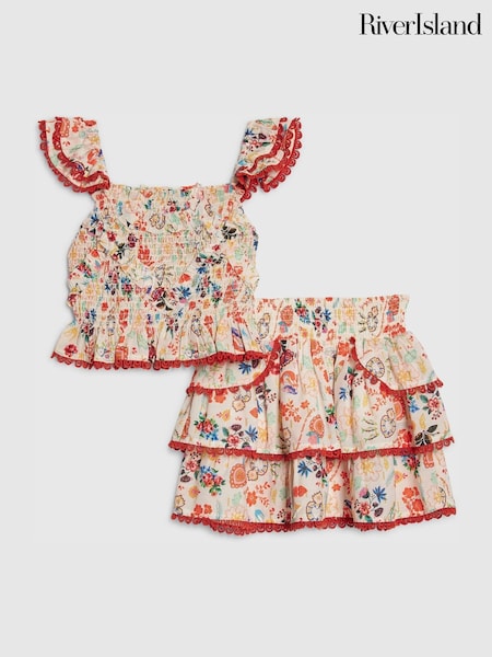 River Island Cream Shirred Mexicana Frill Top & Skirt Set