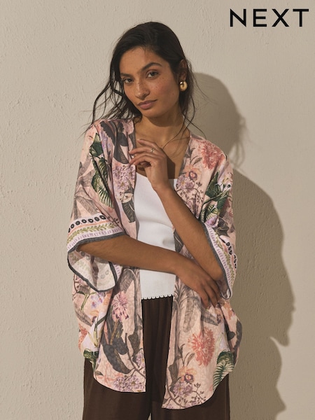 Green/Ecru Kew Collection Botanical Print Linen Rich Square Neck Shift Mini Dress