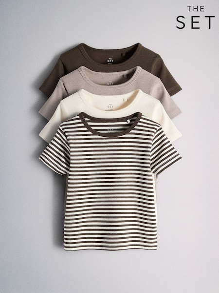 The Set 4 Pack Cropped Jersey Rib Short Sleeve T-Shirt Brown/Cream/Stripe
