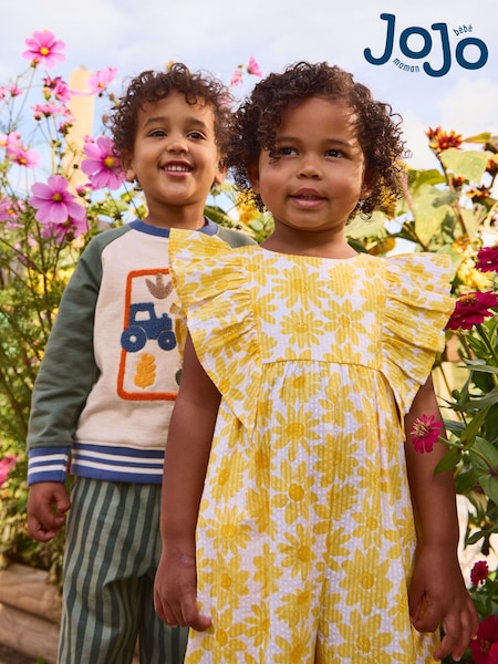 JoJo Maman Bébé Yellow Daisy Seersucker Frill Sleeve Jumpsuit