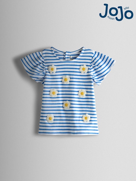 JoJo Maman Bébé Blue Daisy Bouclé Appliqué Frill Sleeve T-Shirt