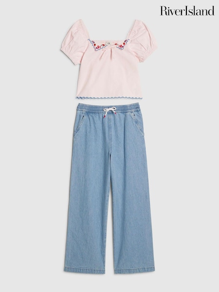 River Island Pink Puff Sleeve Top & Denim Jeans Set