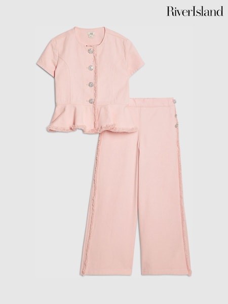 River Island Pink Denim Button Peplum Top & Wide Leg Jeans Set
