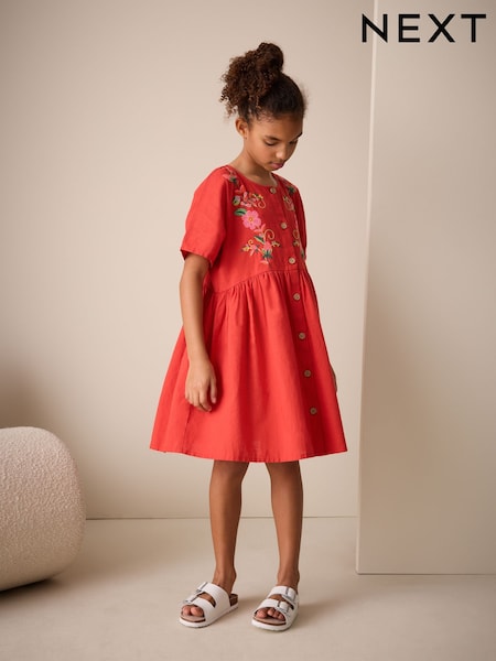 Red Embroidered Short Sleeve Button Through Dress (3-16yrs)