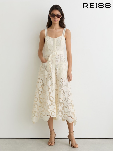 Reiss Cream Kerina Cotton-Blend Lace Button-Front Midi Dress