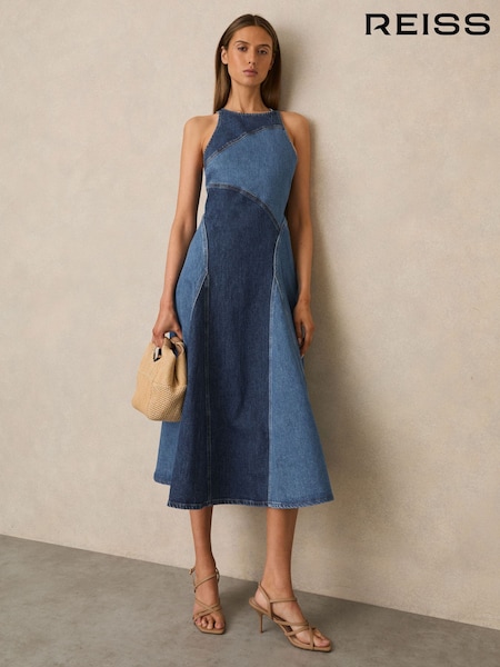 Reiss Blue Wilder Patchwork Chambray Midi Dress