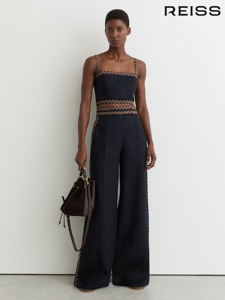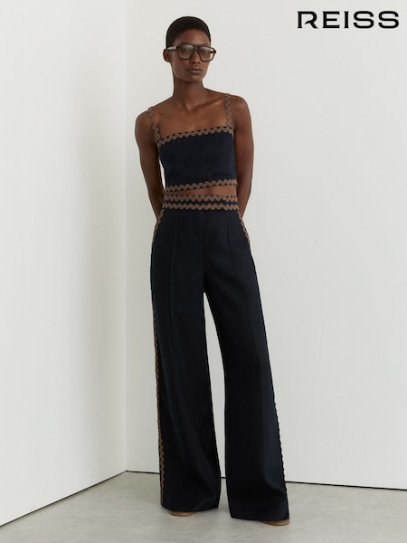 Reiss Navy/Brown Mila Linen Wave-Trim Wide-Leg Trousers