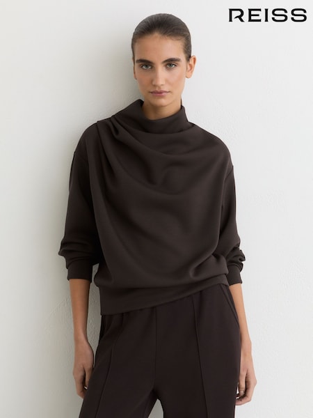 Reiss Dark Chocolate Brown Charlotte Premium Interlock Drape-Neck Sweatshirt
