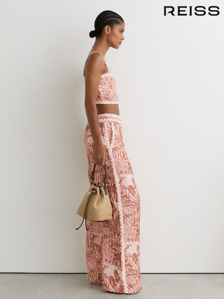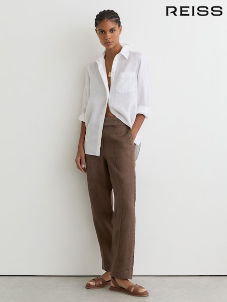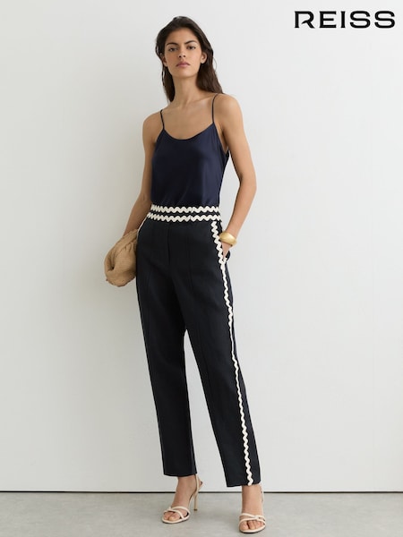Reiss Navy/Brown Mila Linen Wave-Trim Wide-Leg Trousers