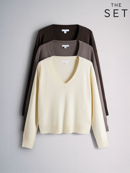 The Set 3 Pack V-Neck Fine Knit Long Sleeve Jumpers Chocolate Brown/Khaki Green/Cream
