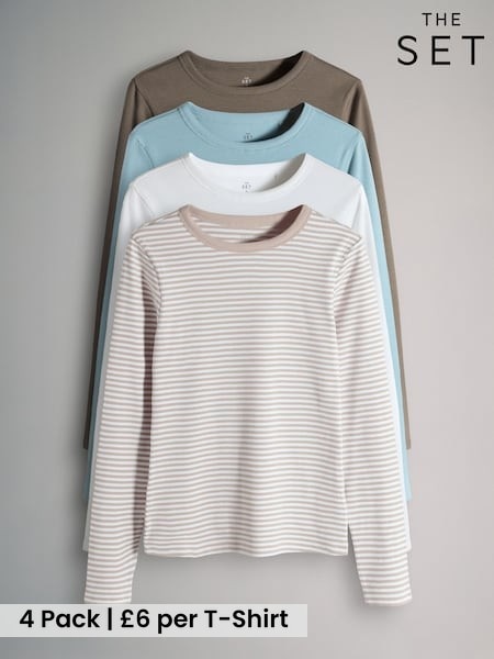 The Set 4 Pack Long Sleeve Ribbed T-Shirts Chocolate Brown/Light Blue/Stripe/White