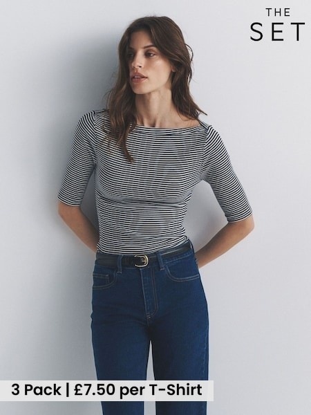 The Set 3 Pack Boat Neck Heavyweight T-Shirts Navy/White/Stripe