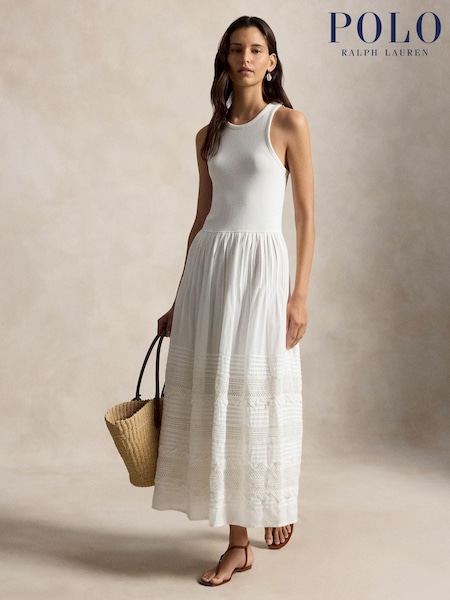 Polo Ralph Lauren White Mixed Media Dress Broderie Anglaise Skirt