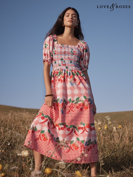 Love & Roses Red Cherry Print Smocked Bodice Puff Sleeve Midi Dress