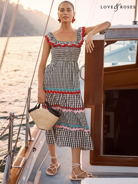 Love & Roses Black Gingham Smocked Ric Rac Ruffle Trim Midi Dress