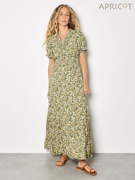 Apricot Light Green Ditsy Floral Smocked Midi Dress