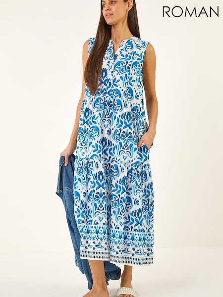 Roman Blue Printed Button Detail Midi Dress