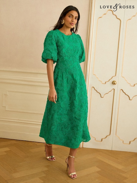 Love & Roses Bright Green Textured Puff Sleeve Crew Neck Midi Dress
