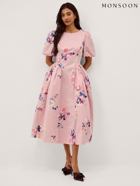 Monsoon Pink Amber Puff Sleeve Floral Midi Dress