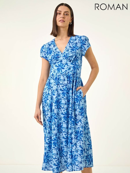 Roman Blue Floral Wrap Midi Dress