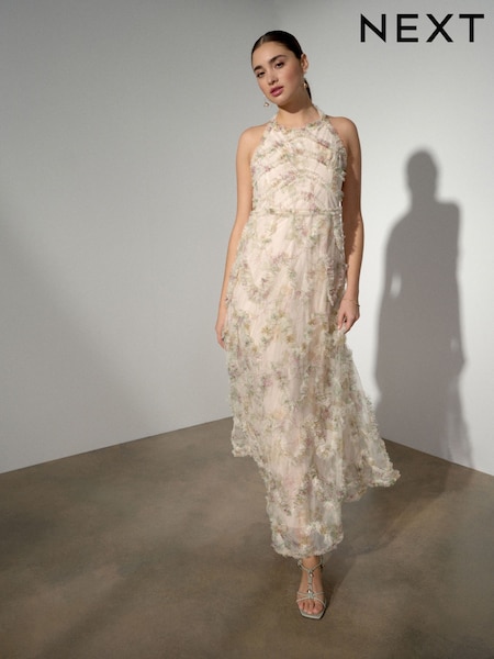 Yellow / Pink Floral Halter Neck Ruffle Maxi Occasion Dress