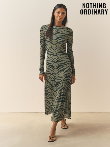 Nothing Ordinary Zebra Print Mesh Slash Neck Long Sleeve Midi Dress