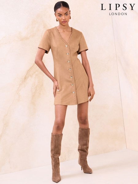 Lipsy Tan Brown Petite Faux Suede Whipstitch Detail Mini Dress