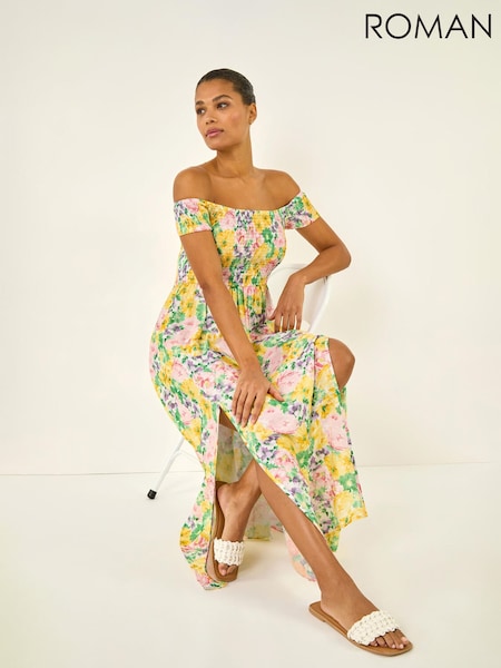 Roman Yellow Floral Print Bardot Shirred Midi Dress
