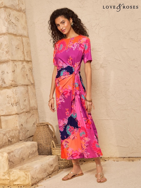 Love & Roses Orange Abstract Print Tie Side Petite T-Shirt Jersey Midi Dress