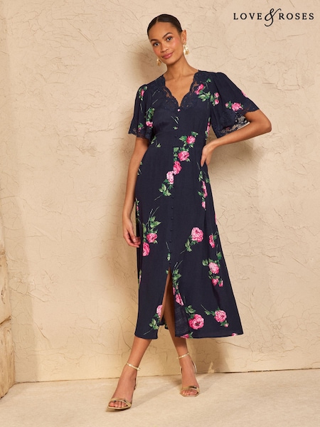 Love & Roses Navy Floral Petite Lace Midaxi Tea Dress