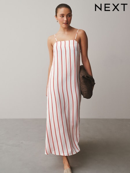 Red/White Stripe Linen Rich Square Neck Cami Midi Dress