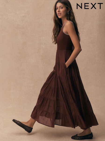 Chocolate Brown Sleeveless Square Neck Ribbed Midi Dress