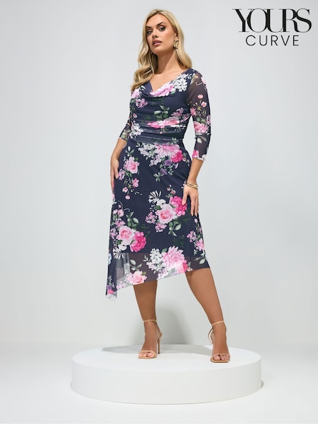 Yours Curve Blue London Floral Cowl Neck Asymmetric Mesh Dress