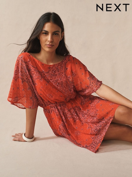 Red Paisley Print Kimono Sleeve Waisted Mini Dress