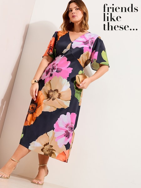 Friends Like These Navy Curve V-Neck Floral Printed Satin Midi Dress