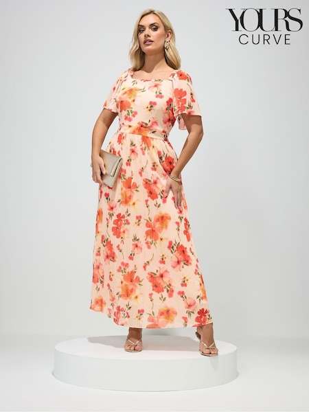 Yours Curve White London Floral Square Neck Pleated Maxi Dress