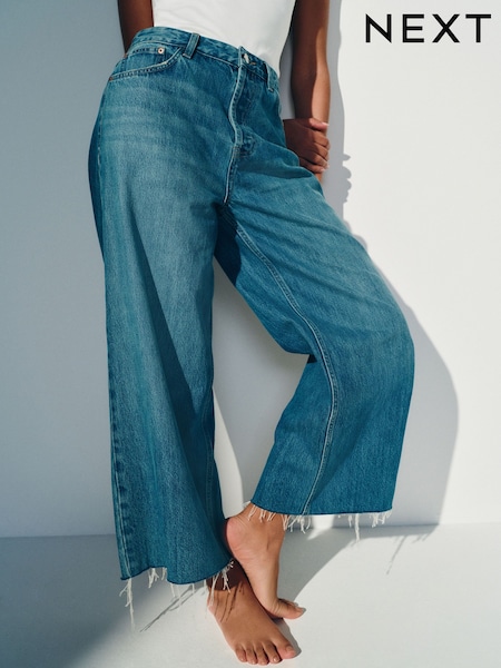 Mid Blue Wide Leg Raw Hem Cropped Jeans