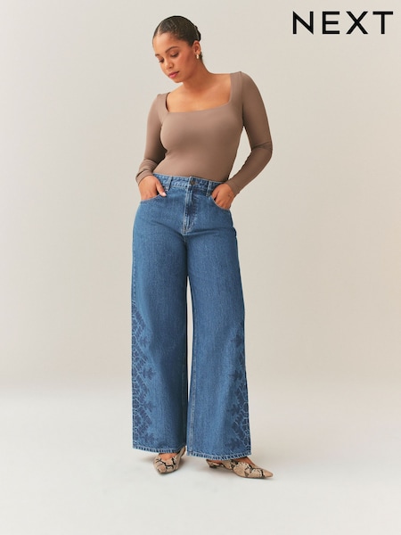 Embroidered Mid Blue Denim Hourglass Wide Leg Jeans
