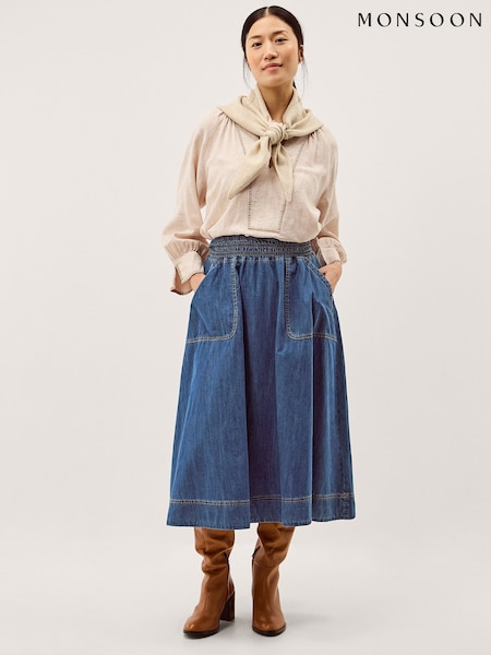 Monsoon Blue Sophie Shirred Denim Midi Skirt