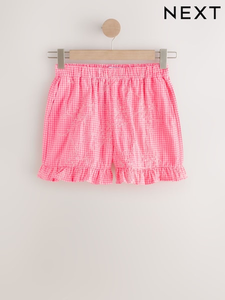 Neon Pink/White Gingham Shorts With Embroidery