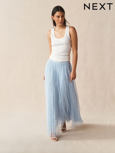 Blue Mesh and Lace Pleated Maxi Skirt