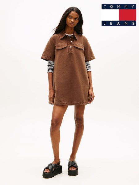 Tommy Jeans Brown Washed Canvas Mini Short Sleeve Shirt Dress