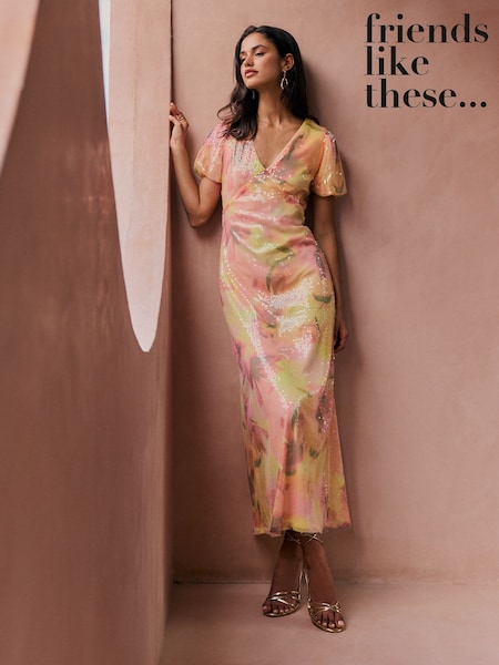 Friends Like These Pink Floral All-Over Sequin Puff Sleeve Midi Dress
