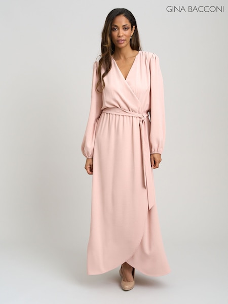 Gina Bacconi Pink Bow Wrap Long Sleeve Maxi Dress