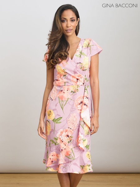 Gina Bacconi Pink Debby Flutted Sleeve Wrap Dress